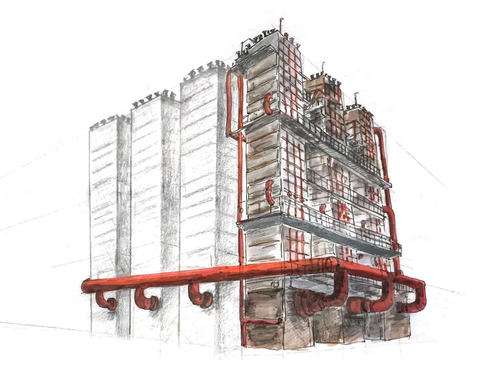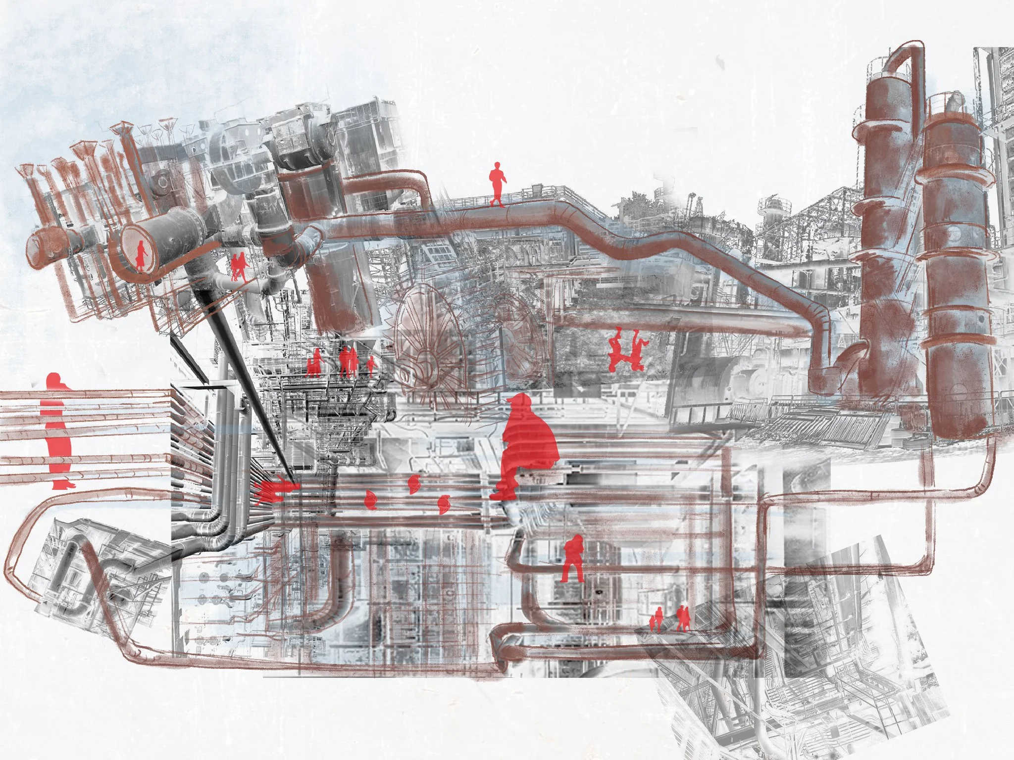 Machina is a visualization-driven architectural exploration inspired by the industrial history of Britannia Beach, British Columbia, using drawing and spatial narrative as primary design tools. The project investigates how architecture can communicate atmosphere, movement, and human interaction through a sequence of experiential spaces designed for both people and water—generation (community gathering spaces), operation (a bathhouse), and storage (hotel with food-and-beverage spaces)—all connected by a continuous architectural “machine.” Influenced by steampunk philosophy, the project questions how humans and non-human entities interact with architectural systems.